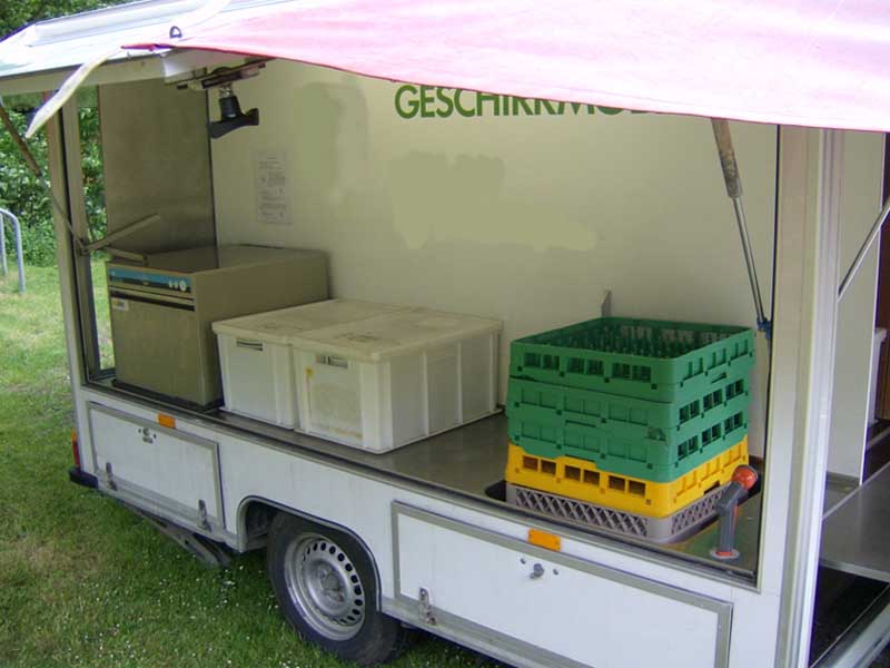 Das Geschirrmobil bietet für bis zu 300 Personen Ess-, Kaffeegeschirr, Suppenteller und Dessertteller.